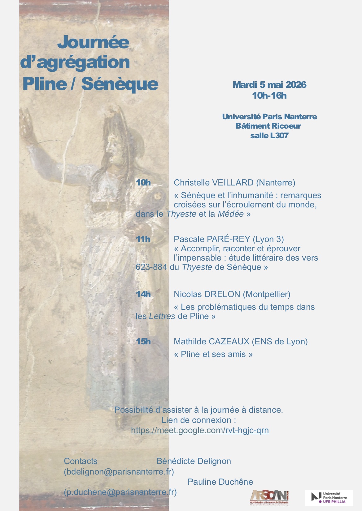 Cette journée portera sur Pline le Jeune et Sénèque et est organisée par Bénédicte Delignon et Pauline Duchêne, toutes deux enseignantes à Nanterre. Elle pourra être suivie sur place ou à distance. Lien de connexion: https://meet.google.com/rvt-hgjc-qrn